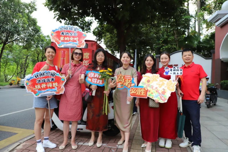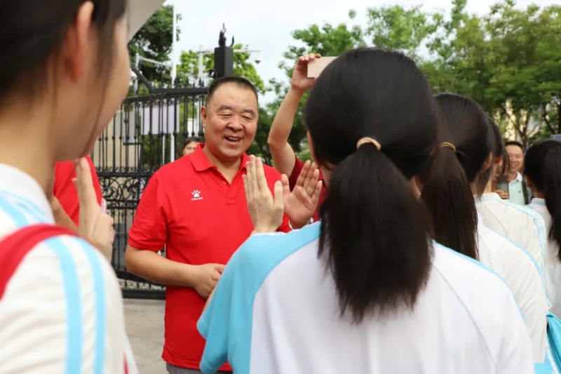 “加油!你们是最棒的!”执行校长唐喜杨、常务副校长付博等学校领导身着寓意“鸿运当头”的红色上衣,以温暖的微笑和张开的手臂,迎接每一位奔赴考场的学子。