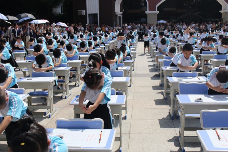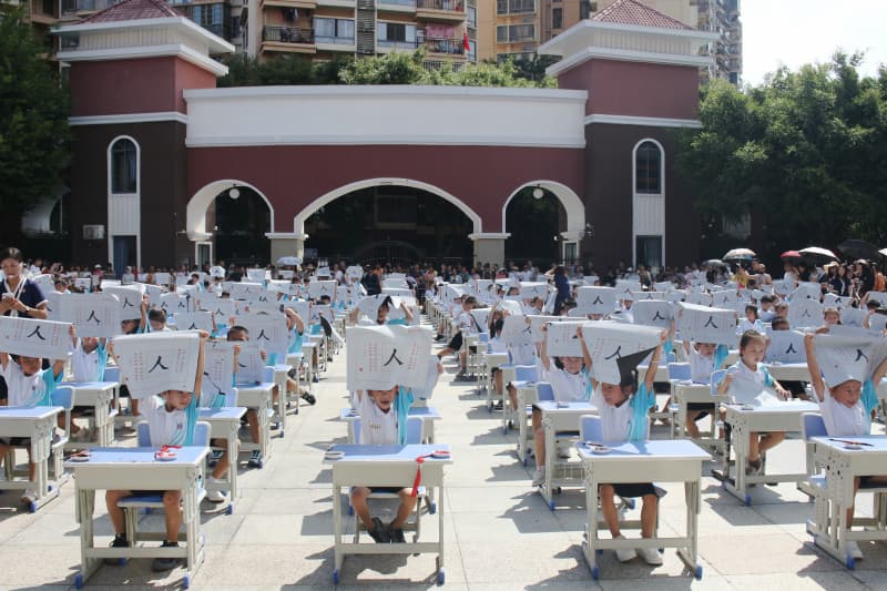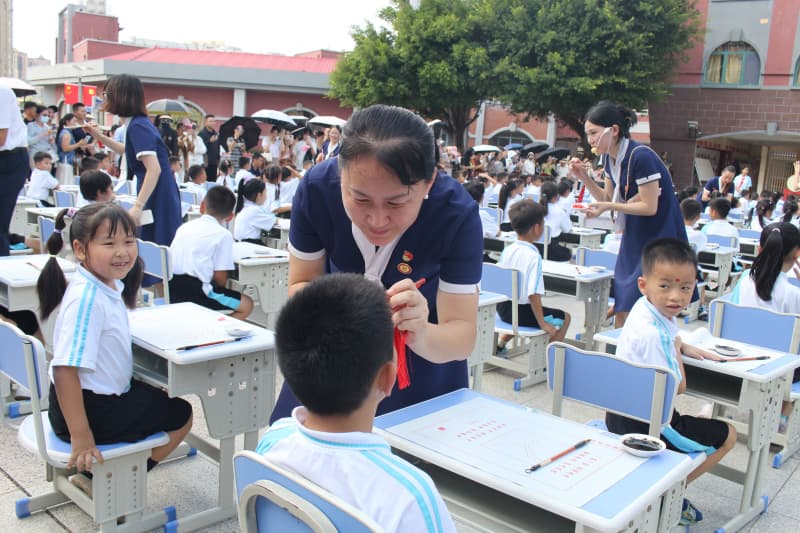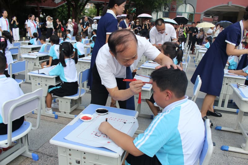 朱砂启智,亦称“开天眼”。学校领导及各班教师手持毛笔,蘸取朱砂,在同学们的额头正中点上小红痣,“痣”与“智”谐音,这颗“智慧痣”象征着从此开启智慧之门,眼明心亮,鼓励同学们热爱学习,追求知识。