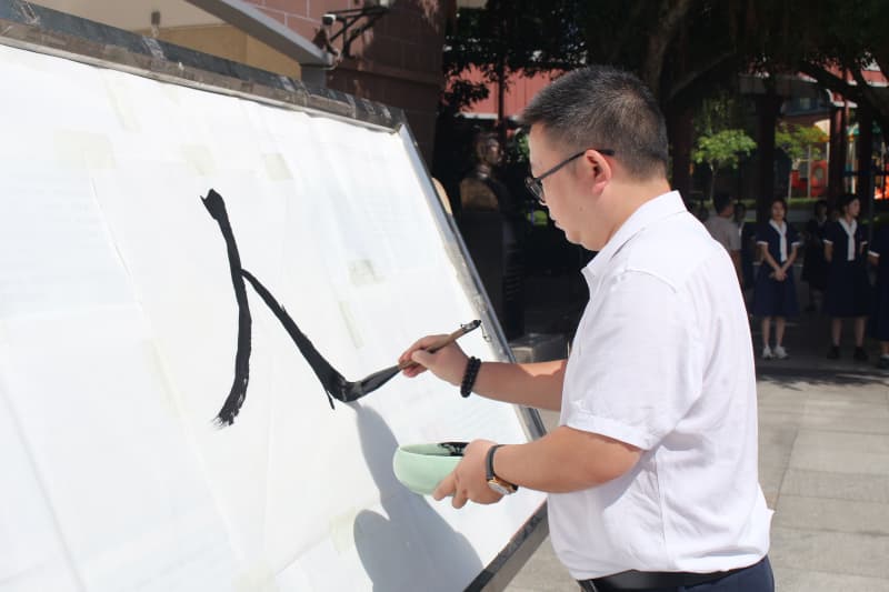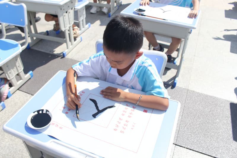 “人”字虽然简单,却蕴含着深刻的含义,传达了做人应当正直和坦率的道理。书法老师韦昌毅、肖后国、梁曦元在黑板上展示了“人”字的书写方法,随后在老师们的指导下,同学们认真地一笔一划地书写“人”字,尽管笔触稚嫩,却透露出“先学做人,再学做事”的教育初衷。