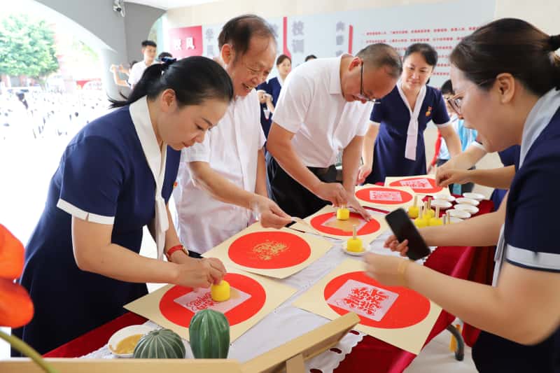 在小学部大厅,一曲空灵清越的《高山流水》优雅回荡。学校领导们将现场制作的拓印作品赠与教师,每一幅拓片都满载着祝福与感恩;教师则含笑回赠亲手制作的宋锦挂件,繁复精美的纹样不仅蕴含着吉祥的寓意,更织进了彼此对教育事业的热爱。