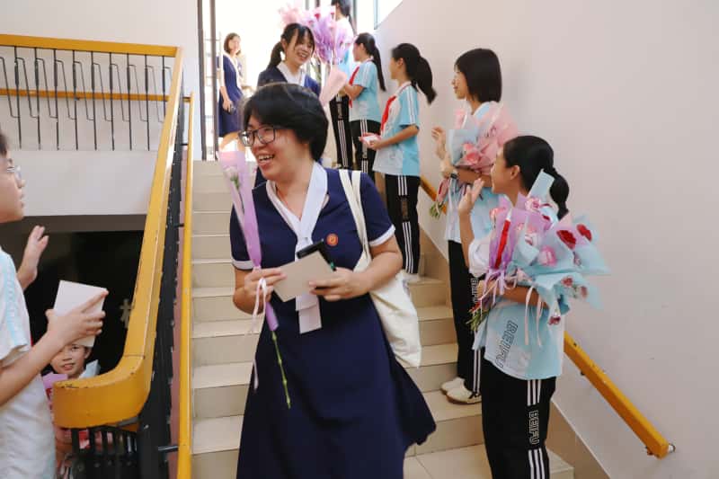 “老师,您辛苦了!”“祝老师节日快乐,永远年轻!”……伴随着一声声真挚的问候,同学们把一支支娇艳欲滴的康乃馨和满载真情的贺卡郑重地送到每一位老师手中。一支鲜花,让辛勤的汗水有了芬芳;一张贺卡,让平凡的坚守充满了力量。尊师重教的传统美德,在这一刻有了具象化的动人模样。