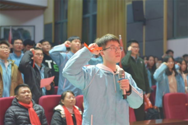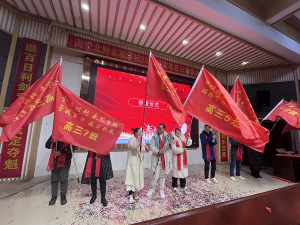 活动中,学校领导郑重地把班旗授予各班班主任。 班主任们从容挥舞战旗, 点燃了同学们决战高考、圆梦青春的激情。全体高三教师激情宣誓:“决战百日,为学生保驾护航。拼搏百日,为学校添彩争光!厉兵秣马,奋勇前行!”高三年级全体教师将与同学们风雨同行,并肩作战,护航高考。全体高三学生庄严宣誓:“珍惜一百天,让飞翔的梦在六月张开翅膀;奋斗一百天,让雄心与智慧在六月发出光芒;拼搏一百天,让父母恩师在六月畅想期望!”铮铮誓言, 斗志昂扬。